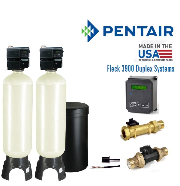 Features include two Fleck 3900/1800 3200NXT Simplex Systems with a 3" electronic meter for each valve and includes two commercial brine tanks with the Clack 494 commercial shutoff valve.