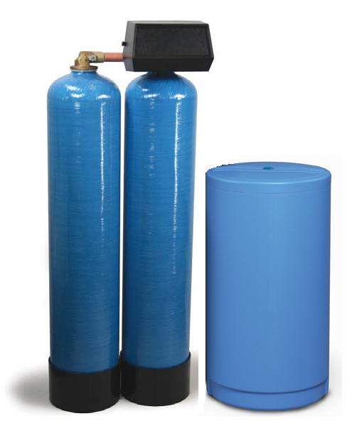 Softeners include Fleck 9000 meter valve with 1600 time brining, 3/4" stainless steel bypass, blue polyglass mineral tanks, and standard mesh resin.